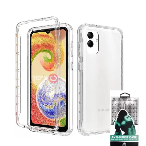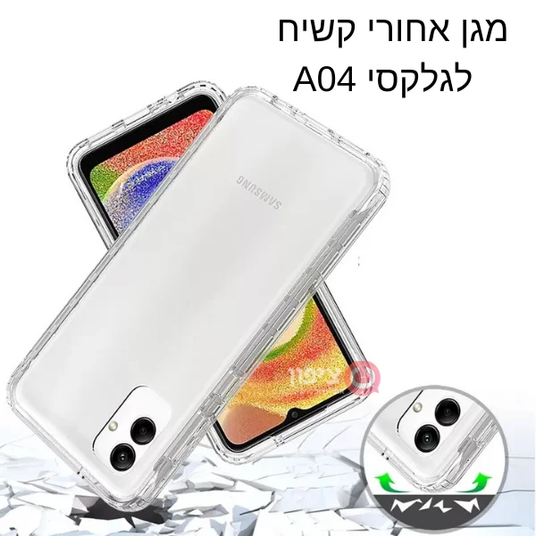 כיסוי אחורי גלקסי A04 בצבע שקוף עשוי צדדי סיליקון וגב קשיח למניעת שריטות.