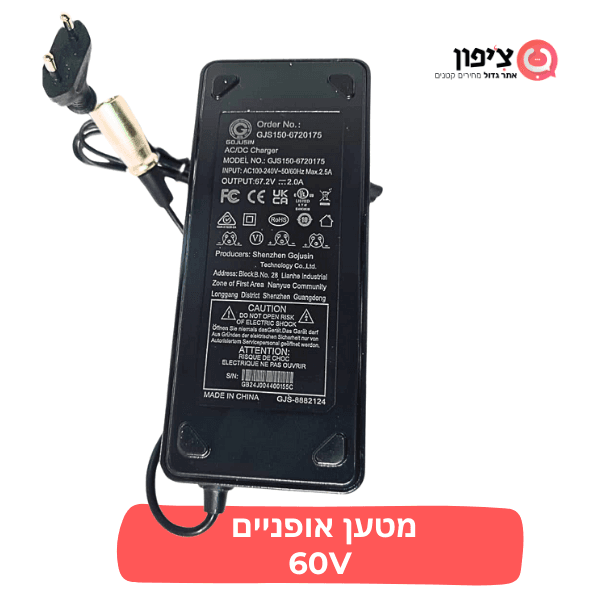 שימו לב מתאים לסוללת ליטיום 60V בלבד!! אורך כבל טעינה 1.5 מטר + אורך כבל לשקע לקיר עוד 1.2 מטר. אם אתם צריכים מטען לאופניים חשמליים 48V לחץ כאן. אם אתם צריכים מטען לאופניים 36V לחץ כאן. וכמובן משלוח מהיר חינם עבור המטען כי עברתם את הסכום של 121 שקלים אתם זכאים למשלוח חינם - תנצלו את זה ותצרפו עוד דברים...