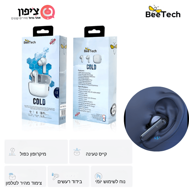 אוזניות בלוטוס עם איכות שיחות מעולה וסינון רעש סביבתי מתקדם שנשמעים כאילו אתה מדבר בחדר שקט, נוח לשימוש יום יומי באוזן. מותג: BeeTech. דגם: TWS-COLD. צבע: שחור. אחריות: 12 חודשים על ידי היבואן הרישמי.