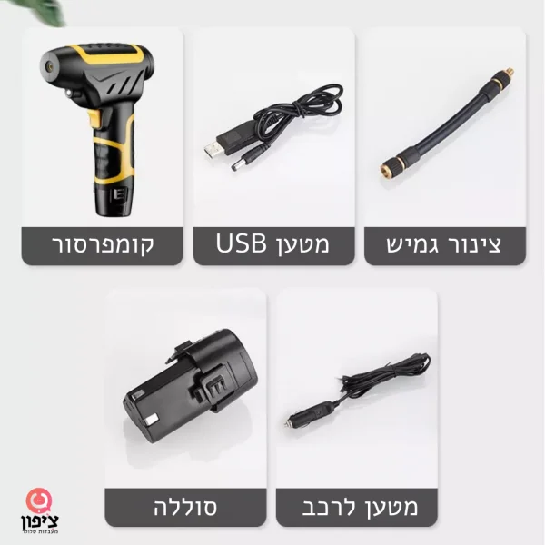 קומפרסור נטען לניפוח גלגלים, כדורים, ועוד. כולל פנס תאורה הפועל בזמן הפעלת המשאבה.