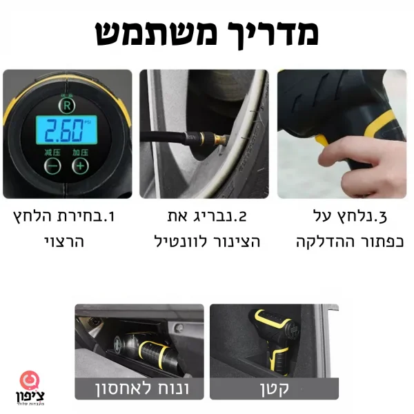 משאבת אוויר נטענת הכולל צד דיגיטלי המראה את עוצמת לחץ הצמיג ובנוסף ניתן לבחור את העוצמה שאנחנו רוצים לנפתח את הגלגל וכאשר הלחץ יגיע משאבת האוויר תפסיק לעבוד.