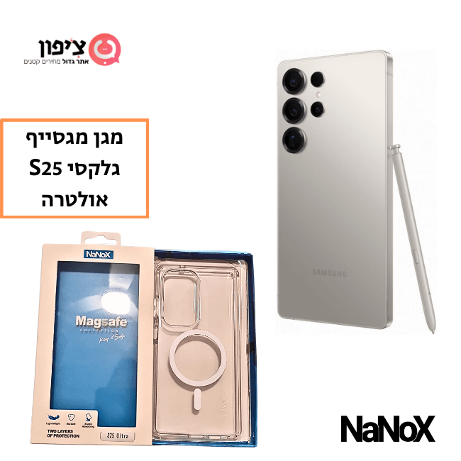 כיסוי מבית NaNoX נבנה להגנה טכנית מתקדמת. הכיסוי שומר על נוחות השימוש במכשיר גדול 6.9 אינצ'. הצדדים עשויים סיליקון קשיח עם עמידות לנפילות וספיגת זעזועים של 80%, והגב מפלסטיק קשיח (פוליקרבונט, קשיות 9H) שמונע שריטות בעומק של עד 0.5 מ"מ. הכיסוי תומך בטעינה אלחוטית בתקן Qi עם חיבור מגנטי תואם, בהספק של עד 15W, לטעינה יציבה. הכפתורים מעוצבים עם מנגנון לחיצה רספונסיבי, והחריצים מותאמים לגלקסי S25 Ultra. הכיסוי מציע אחיזה נוחה ביד אחת עם חיכוך מוגבר ב-15%, ומבטיח גישה חלקה לכל היציאות, כולל מערך המצלמות הגדול וכן בולט מעט מעל המצלמה. ובולט מעט מעל המסך!