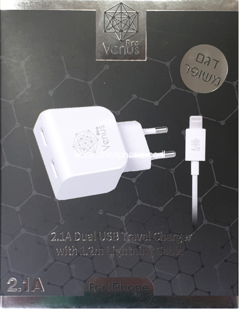 חברת וונוס מביאה לכם מטען עם 2 יציאות USB מאושר מכון התקנים הישראלי, הכולל כבל לאייפון 5 ומעלה, הכולל אייפון 11 ואייפדים.