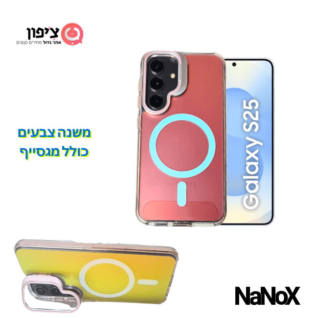 כיסוי מראה לגלקסי S25 עם אפקט צבע משתנה, תמיכה בטעינה MagSafe, מגן מצלמה חכם ומעמד מובנה. עיצוב אלגנטי שמציע גם הגנה וגם פונקציונליות. כיסוי איכותי מאוד השומר על המכשיר מפני נפילות בולט מעט מעל המצלמה ובולט מעט מעל המסך!