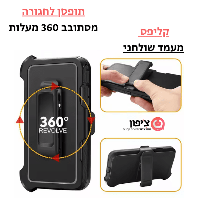 מגיע עם קליפס חגורה מסתובב ונוח, וסטנד מובנה לצפייה נוחה בכל מצב – בבית, בעבודה או בשטח.